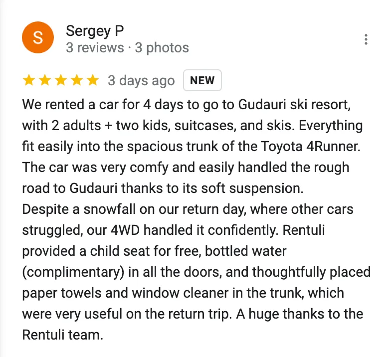 Mike H.Dubai"Great experience with Rentuli! Rented car in Tbilisi. The 4Runner was perfect for our Georgia trip, clean and reliable. Excellent service and easy rental process. Highly recommend!"