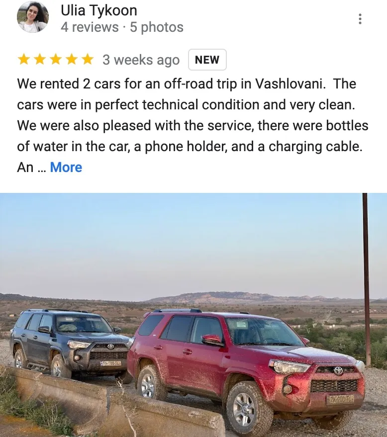 UliyaWe rented 2 cars for an off-road trip in Vashlovani. The cars were in perfect technical condition and very clean. We were also pleased with the service, there were bottles of water in the car, a phone holder, and a charging cable. An amazing experience of comfortable and high-quality rental, which compares very favorably with any other car rental service in Georgia.